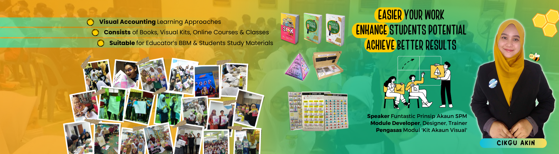 🔥 Membina lebih 10 Modul Akaun berbentuk Buku, E-learning ‘Akaun Visual’ dan Kit Akaun. Sering berkongsi dan berbagi pengalaman dan content Akaun di laman web cikguakin.com. Modul terbarunya adalah Nota PAV (Penyata Akaun Visual) dan Poket Pelarasan (Ebook).